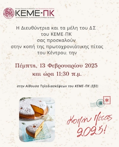 ΘΕΜΑ: Πρόσκληση: Κοπή Πρωτοχρονιάτικης Πίτας του ΚΕΜΕ-ΠΚ | 13.02.2025, 11.30 π.μ. ΑΠΟΣΤΟΛΕΑΣ: Secretary KEME secretary@xxxxxxxxxxx Πρόσκληση Η Διευθύντρια και τα μέλη του Δ.Σ. του ΚΕΜΕ-ΠΚ σας προσκαλούν στην κοπή της Πρωτοχρονιάτικης πίτας του Κέντρου την Πέμπτη, 13 Φεβρουαρίου 2025 και ώρα 11:30 π.μ. στην Αίθουσα Τηλεδιασκέψεων του ΚΕΜΕ-ΠΚ (Εβ3). |